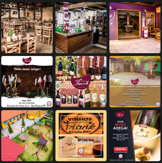 Estrada do Vinho, Km 1 – São Roque (11)47125939 Horário de funcionamento; Adega & Empório: Segunda à Sexta: 10h às 17h Sábados e Domingos: 10h ás 18h. Quiosque: Sexta: 10h às 16h Sábados e Domingos: 12h ás 20h. Restaurante: Sexta: 11:30h às 14h Sábados e Domingos: 11h ás 16h. Site: vinhosfrank.com